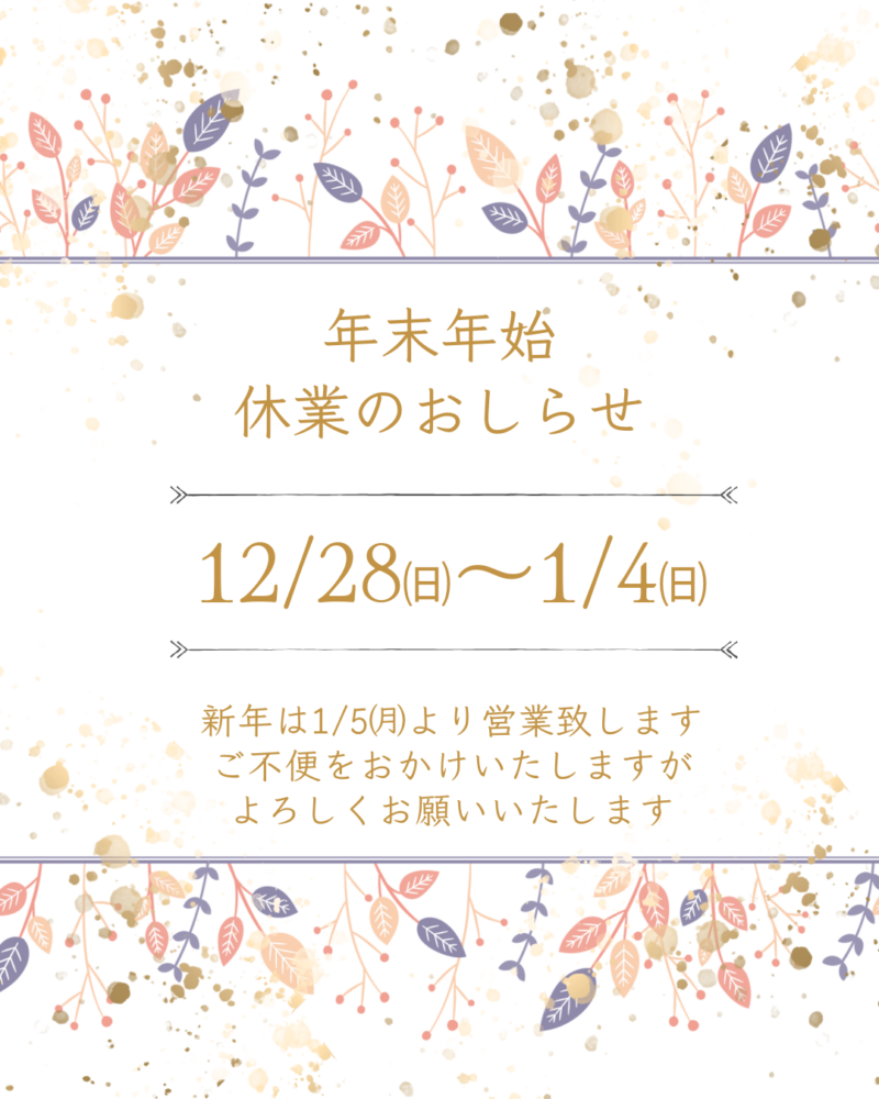 年末年始 休業日のご案内 2025年12月18日2025年12月18日お知らせ, ブログ 年末年始の休業日について、下記の通りご案内いたします。 休業期間:12月28日(日)~1月4日(日)※新年は 1月5日(月)より通常営業 いたします。 休業期間中にいただいた・メール・LINEでのお問い合わせにつきましては、1月5日より順次対応させていただきます。 期間中はご不便をおかけいたしますが、何卒ご理解のほどよろしくお願い申し上げます。